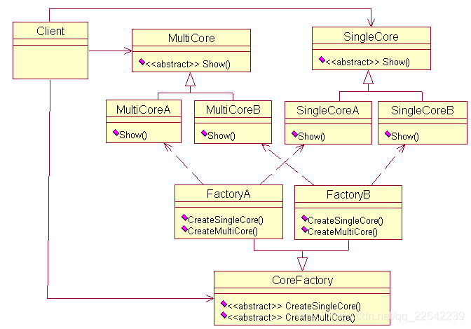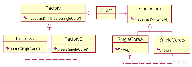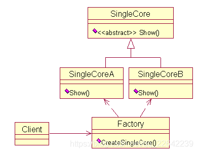 听起来很抽象,还是以刚才的例子解释。这家生产处理器核的产家赚了不少钱,于是决定再开设一个工厂专门用来生产B型号的单核,而原来的工厂专门用来生产A型号的单核。这时,客户要做的是找好工厂,比如要A型号的核,就找A工厂要;否则找B工厂要,不再需要告诉工厂具体要什么型号的处理器核了。下面给出一个实现方案。